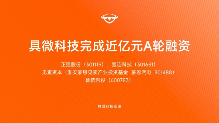 近期,杭州四足机器人企业具微科技宣布完成近亿元A轮融资。本轮融资由正强股份领投,壹连科技、见素资本(淮安豪恩见素产业投资基金,豪恩汽电301488)、鲁信创投跟投(排名不分先后)。本轮融资将用于产品研发生产、团队建设,以及应用场景拓展与生态构建等方面。