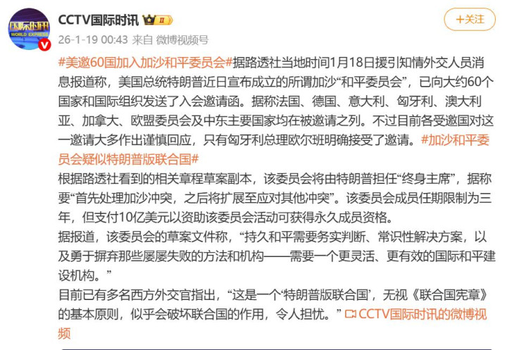 据路透社当地时间1月18日援引知情外交人员消息报道称,美国总统特朗普近日宣布成立的所谓加沙“和平委员会”春安配资,已向大约60个国家和国际组织发送了入会邀请函。据称法国、德国、意大利、匈牙利、澳大利亚、加拿大、欧盟委员会及中东主要国家均在被邀请之列。不过目前各受邀国对这一邀请大多作出谨慎回应,只有匈牙利总理欧尔班明确接受了邀请。